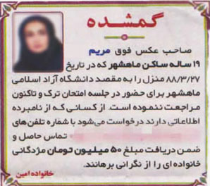 رد این ماجرا را می‌توان در گزارشی که ۱۱ مهر ۱۳۹۰ روزنامه اعتماد تحت عنوان «گمشده‌ای که در بهشت زهرای ماهشهر خفته است» درباره آگهی گمشدن یک دختر منتشر کرد پیگیری کرد. در آن زمان نفوذ شبکه‌های اجتماعی بسیار محدودتر از الان بود و عموما فیس‌بوک محل انتشار بسیار از داده‌های مردمی بود. پاییز ۱۳۹۰ آگهی ناپدیدشدن دختری به نام «مریم» در پست‌های فیس‌بوکی دست به دست می‌شد. پیگیری گروه حوادث این روزنامه نشان داد که «مریم امینی» از روز ۲۷ خرداد ۱۳۸۸ وقتی می‌خواست برای امتحان پایان ترم به محل دانشگاه آزاد ماهشهر برود از خانه خارج و هیچ‌گاه به خانه بازنگشته است. خانواده مریم از جمله خانواده‌های متنفذ ماهشهر بودند و بسیج گسترده‌ای برای یافتن دخترشان تدارک دیدند.