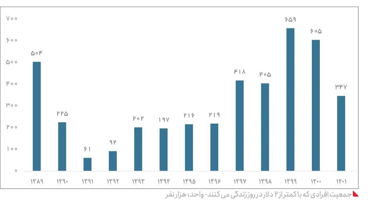 به این ترتیب خط فقر هم تعداد بیشتری از مردم را به سمت خود کشاند؛ به طوری که جمعیت زیر خط فقر از 9 میلیون نفر در سال 1385 به 25 میلیون و 500 هزار نفر در سال 1400 رسید. هنوز آمارهای جدید منتشر نشده که اگر میشد احتمالاً این عدد هم رشد بیشتری را نشان میداد. به درصد هم اگر محاسبه کنیم در سال 1389 نرخ فقر 11/4 درصد بود اما در سال 1400 به 30/4 درصد رسیده است.