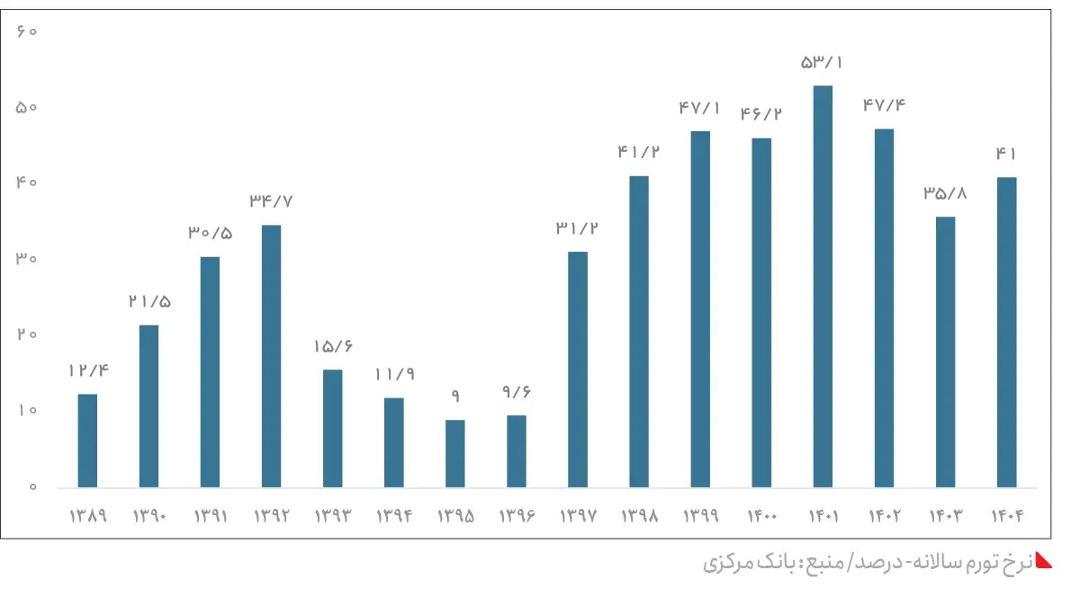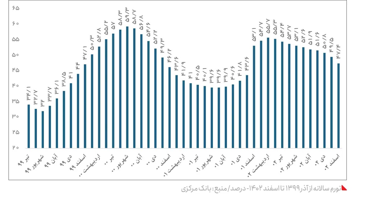 تورم 12 ماه منتهی به شهریور 1400 بیشترین نرخ را ثبت کرده است: 59/3 درصد. در ماههای پس و پیش از آن هم تورم بالای 50 درصد ثبت شده است. از مهر 1400 نرخ تورم به تدریج کم شد اما از فروردین 1402 دوباره نرخها رو به افزایش رفت و بالاترین عدد در اردیبهشت آن سال که 55/7 درصد بود، به ثبت رسید. به این ترتیب در شهریور 1400 ما تورمی در یک قدمی 60 درصد داشتیم.