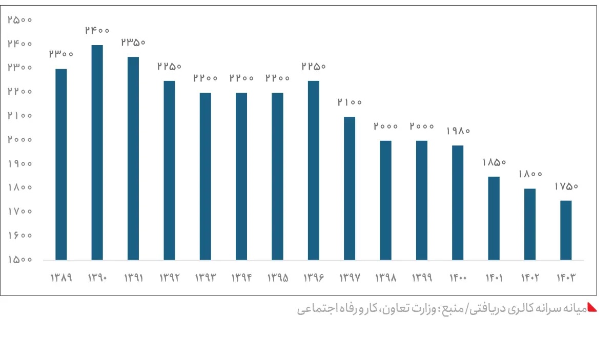 از طرف دیگر میانگین کالری مصرفی سرانه به استثنای سالهای 1386، 1390 و 1396 کاهش داشته است. یعنی با وجود اینکه افراد بخش بیشتری از درآمد خود را صرف هزینه خوراک کردهاند، اما میزان کالری دریافتی آنها کاهش پیدا کرده است.