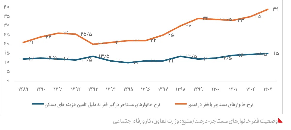 نرخ خانوارهای مستأجر با فقر درآمدی حدود 25 درصد در سال 1397 به 39 درصد در سال 1403 رسیده. در همین دوره، نرخ خانوارهای مستأجری که به دلیل تأمین هزینههای مسکن درگیر فقر شدند هم از 11 درصد به 15 درصد افزایش پیدا کرده. در این بخش نباید به تحولاتی که در کیفیت مسکن و جابهجایی خانوارها در مناطق حاشیهای اتفاقافتاده بیتوجه بود.