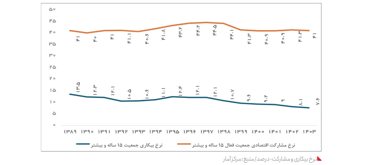 اما نرخ بیکاری که برعکس شاخصهای قبلی بهبود پیدا کرده باید از دو بُعد بررسی شود. اول اینکه این کاهش تا حدودی به کاهش نرخ مشارکت اقتصادی جمعیت مربوط میشود. یعنی بخشی از جمعیت بیکار از یافتن شغل ناامید شدند و از جمعیت در جستوجوی کار خارج شدهاند.