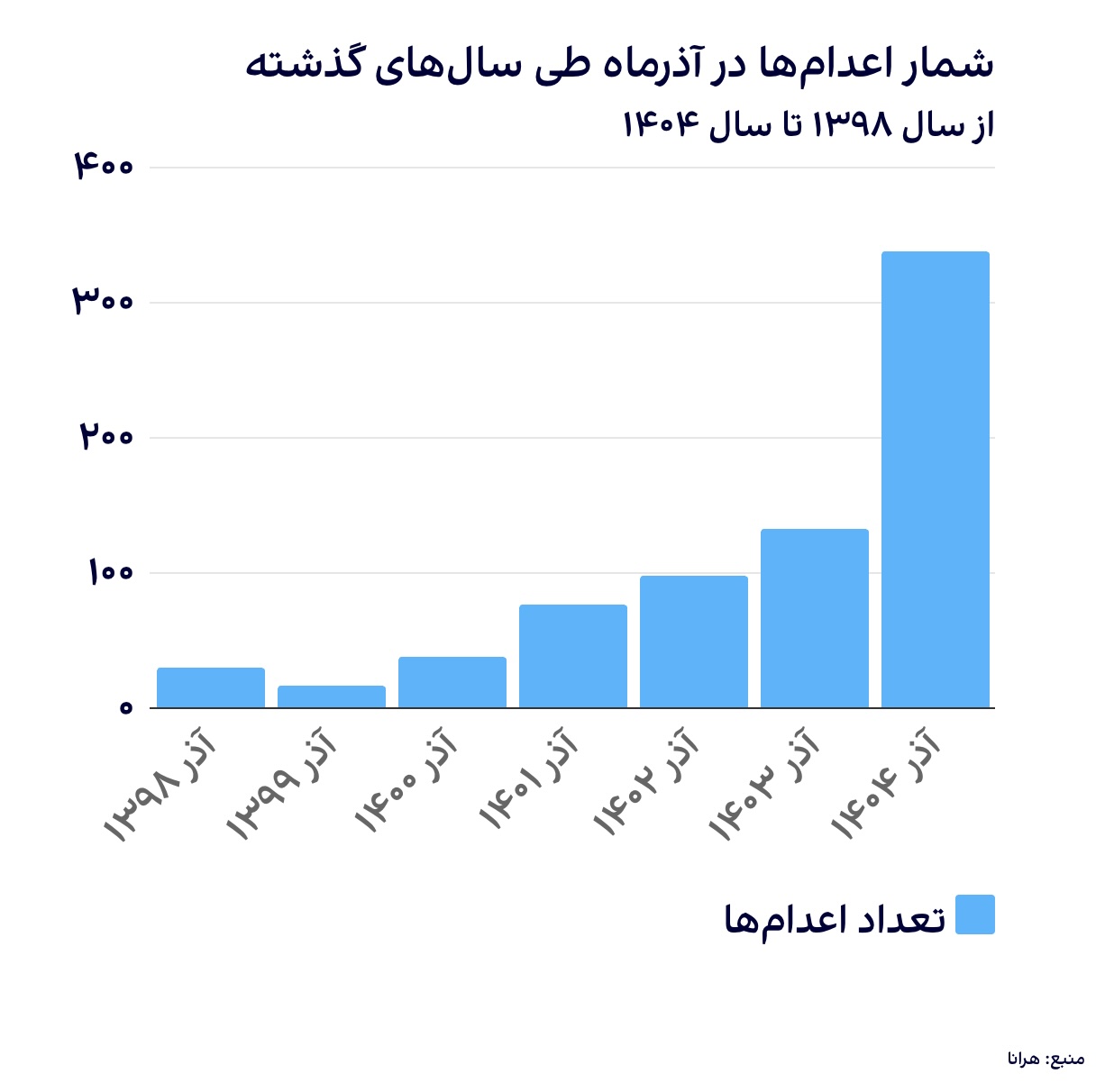 بررسی آمارهای هرانا نشان میدهد شمار اعدامها در آذرماه طی سالهای اخیر روندی بهشدت افزایشی داشته و از دستکم ۳۰ مورد در آذر ۱۳۹۸، با افزایشی بیش از ۱۱ برابر، به حداقل ۳۳۸ مورد در آذر ۱۴۰۴ رسیده است.