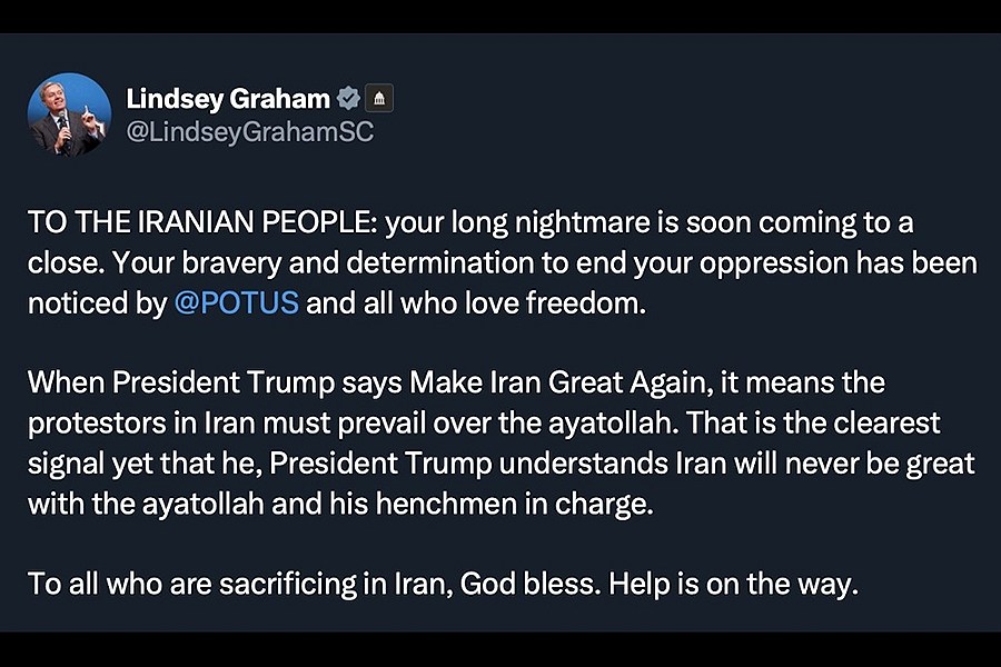 لیندزی گراهام روز دوشنبه ۱۵ دی ۱۴۰۴ با انتشار تصویری از خود به همراه دونالد ترامپ در شبکه ایکس نوشت رییسجمهوری آمریکا این کشور را در داخل و خارج «نیرومندتر از همیشه» بازگردانده است. در این تصویر دونالد ترامپ کلاهی در دست دارد که روی آن نوشته شده «عظمت را دوباره به ایران بازگردانیم».