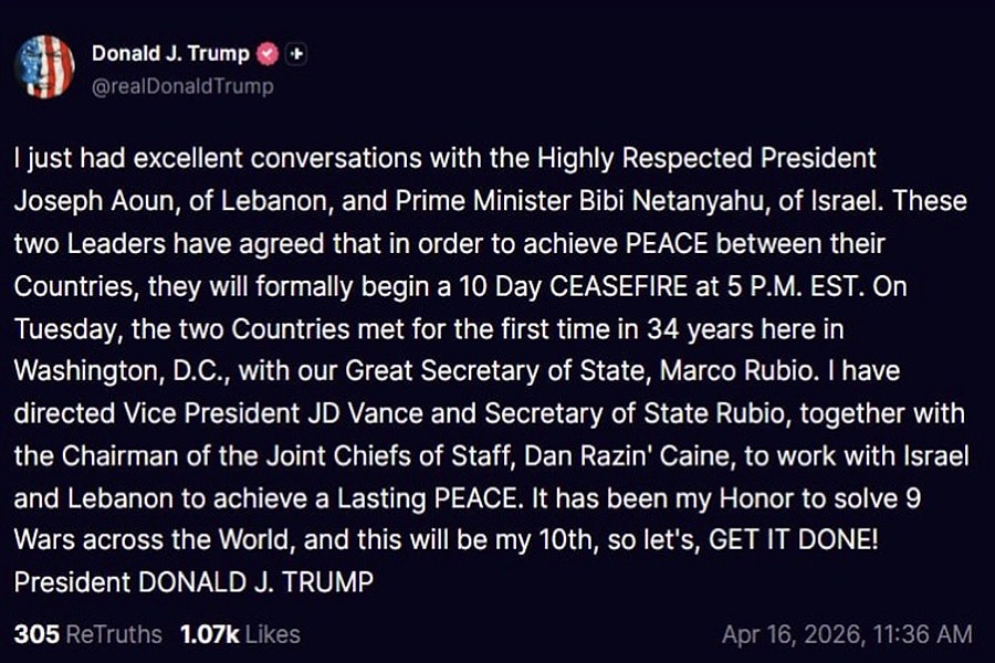 ترامپ در تروث سوشال نوشت با جوزف عون و بنیامین نتانیاهو گفتوگوهای بسیار خوبی داشته و دو طرف توافق کردهاند از ساعت ۵ عصر به وقت شرق آمریکا آتشبس ۱۰ روزه را آغاز کنند.